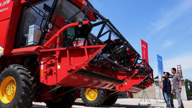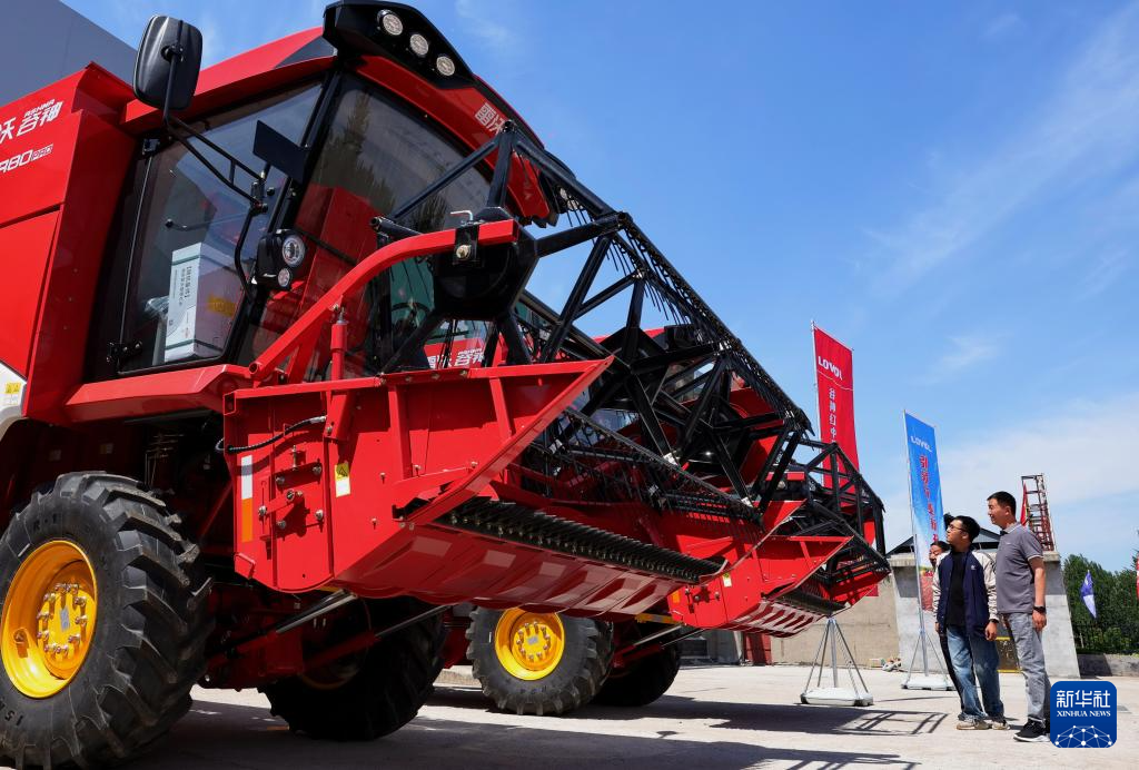 5月28日,在河北省晋州市一家农机销售公司,顾客选购联合收割机。