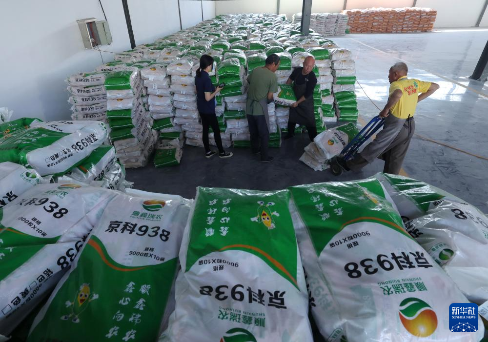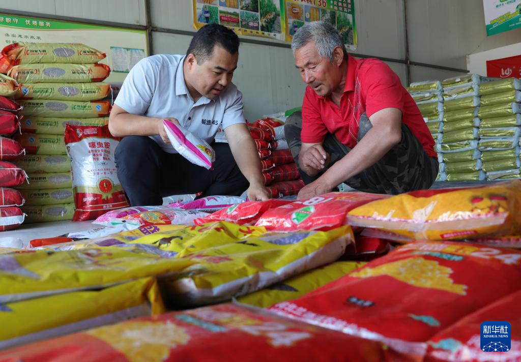 5月28日,河北省晋州市一家农资销售站的工作人员(左)在向一位农民推荐玉米种。