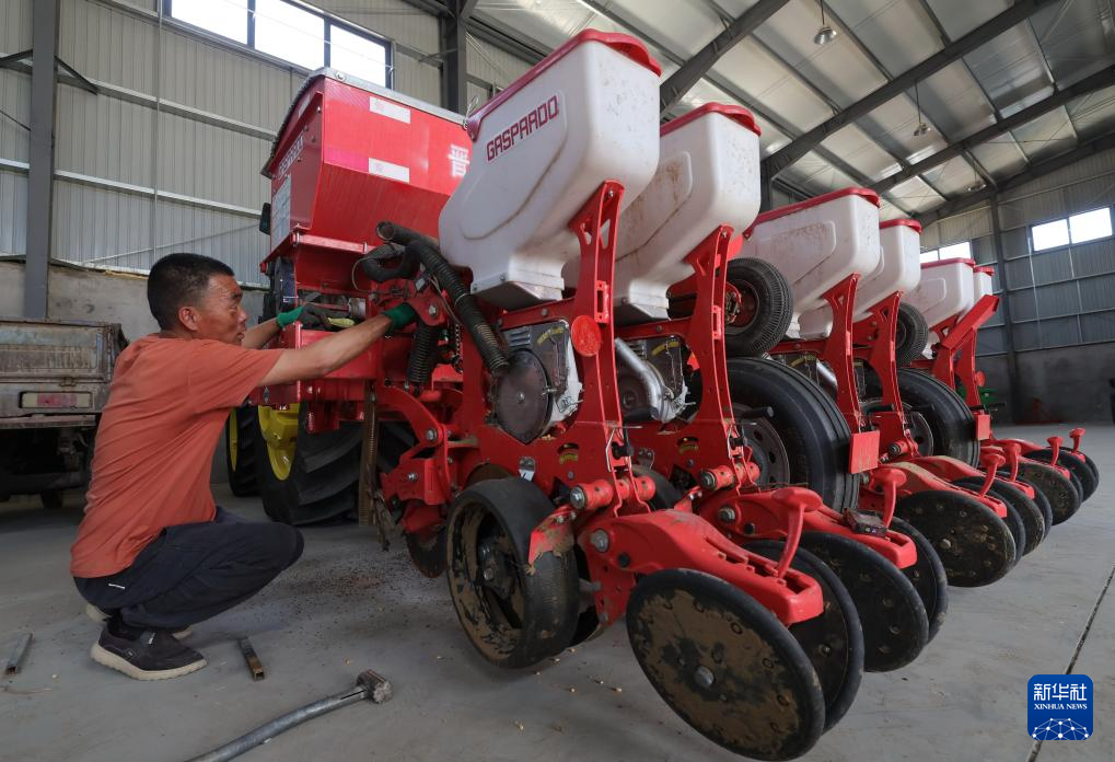 5月28日,在河北省晋州市德农种植专业合作社,农机手在检修玉米播种机。