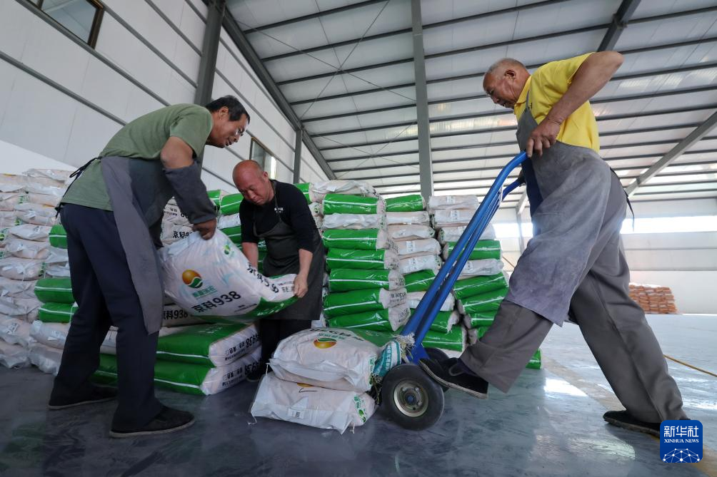 5月28日,河北省晋州市一家农资销售公司的工人在库房搬运农资。