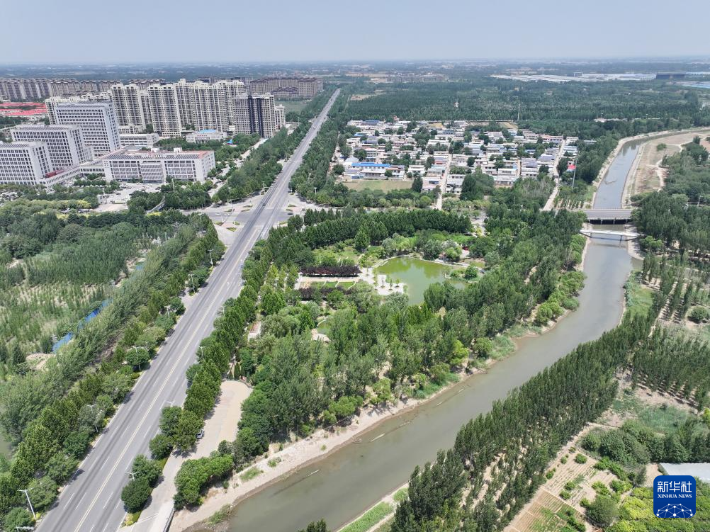 河北省河间市古洋河公园景色(6月28日摄,无人机照片)。