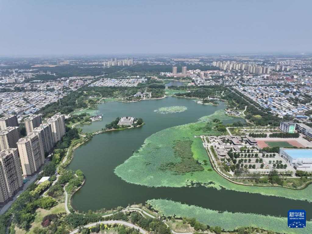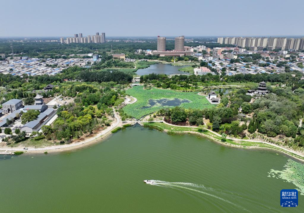 河北省河间市瀛洲公园景色(6月28日摄,无人机照片)。