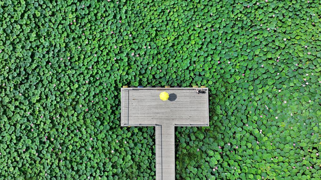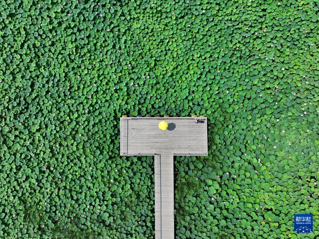 6月28日,游客在河北省河间市瀛洲公园内欣赏荷花(无人机照片)。