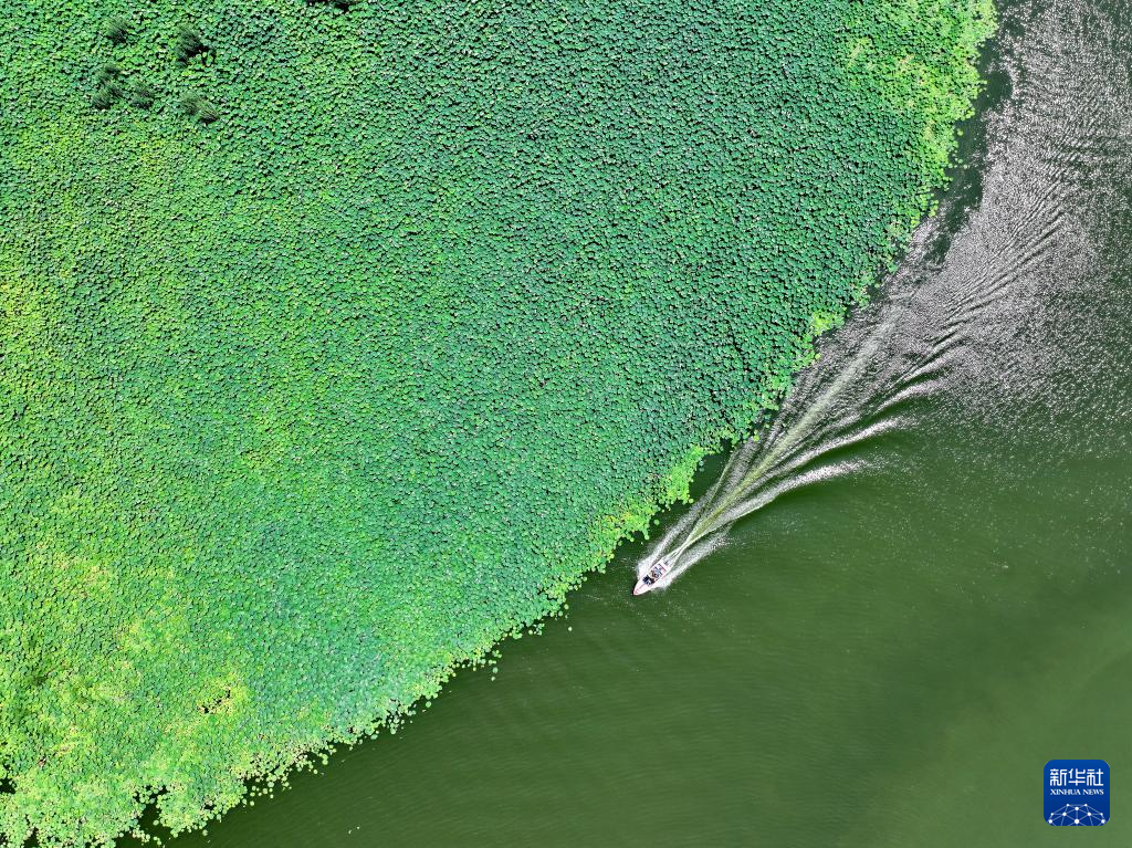 6月28日,游船在河北省河间市瀛洲公园的水面上行驶(无人机照片)。
