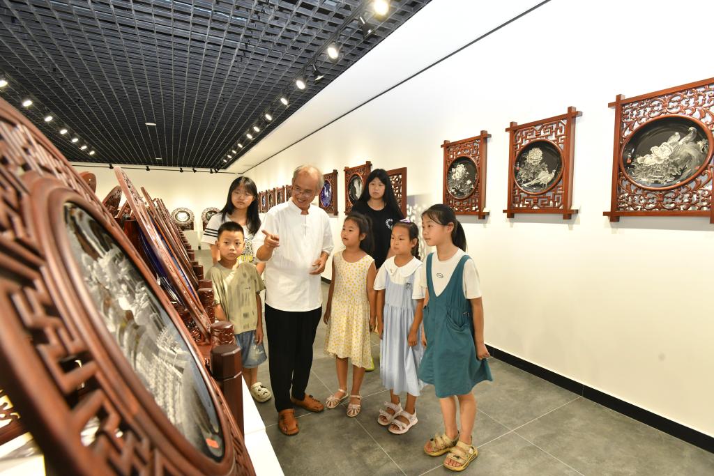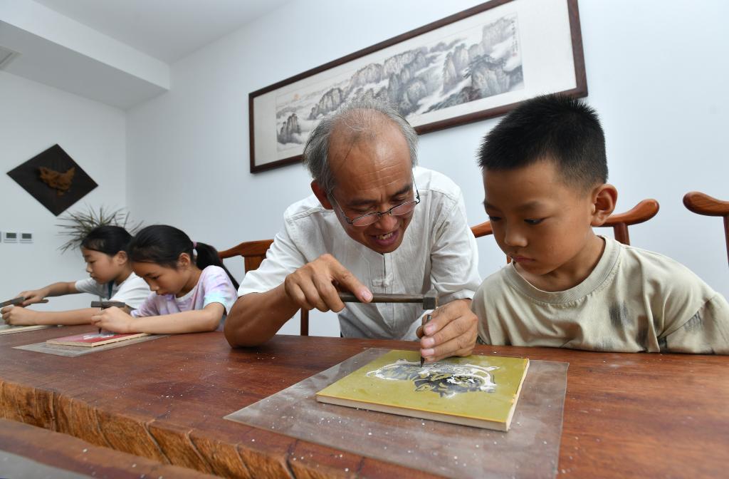 7月26日,在河间市刻瓷博物馆,刻瓷艺人指导小学生学习刻瓷技艺。