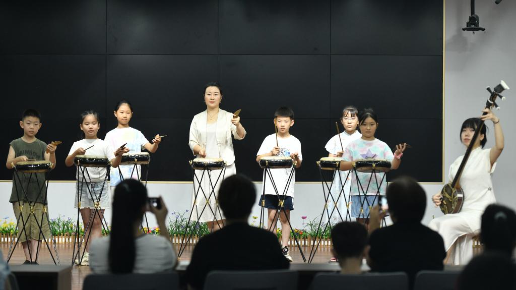 7月26日,在河间市第一实验小学,西河大鼓艺人指导学生学习西河大鼓。
