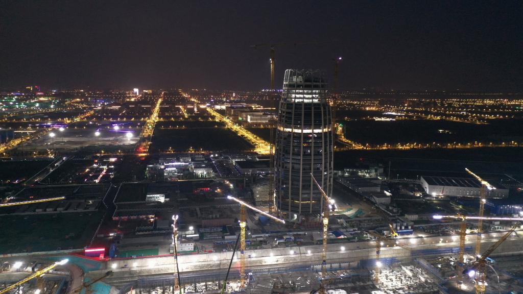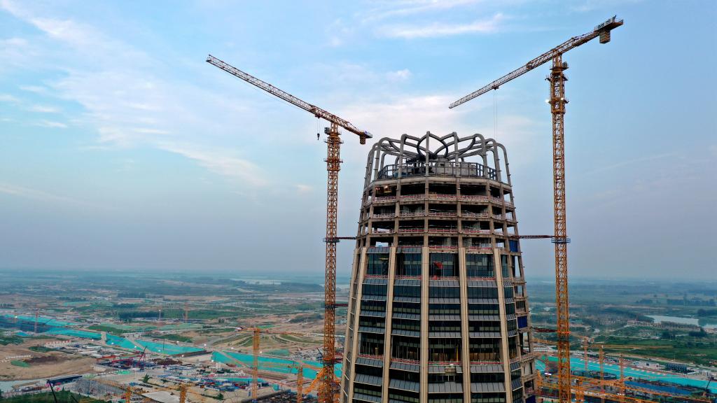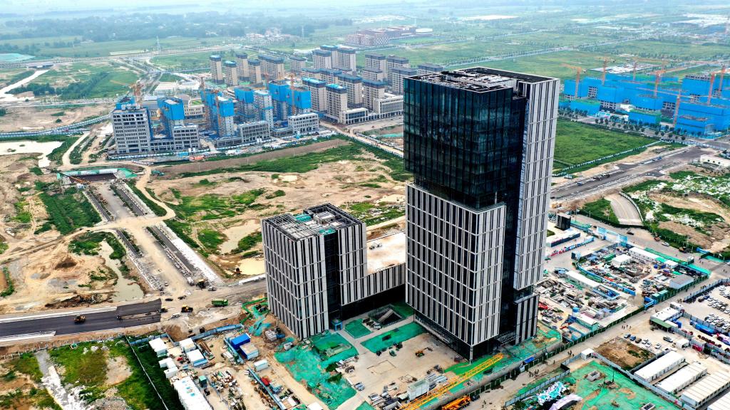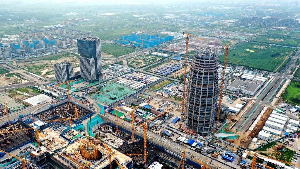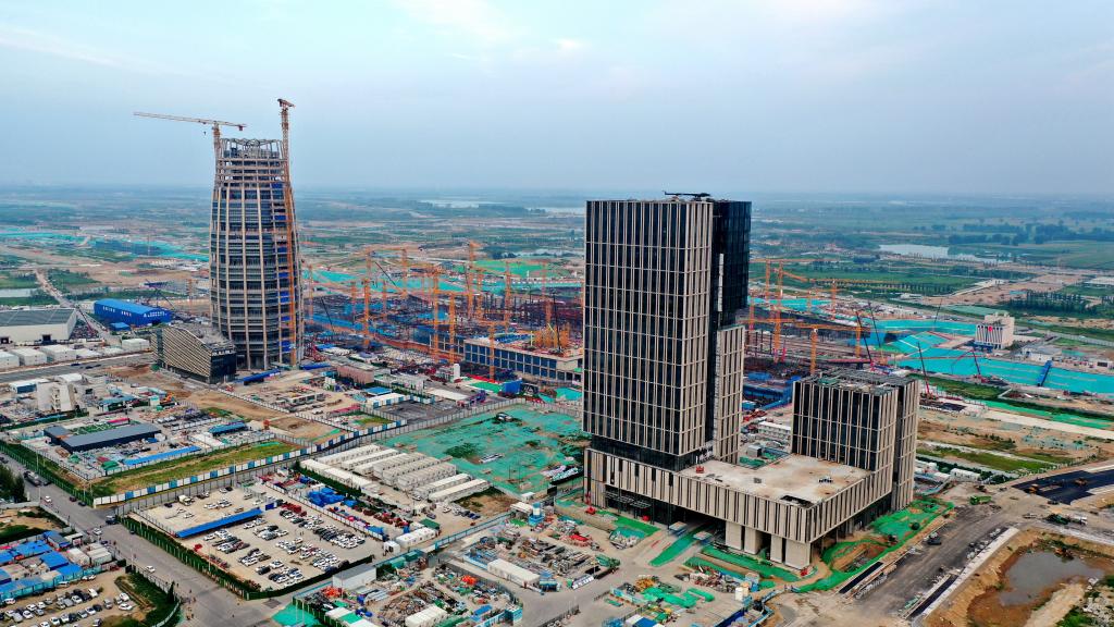 这是位于雄安新区启动区内的中国中化总部大楼建设现场(8月8日摄,无人机照片)。目前大楼已封顶,正在开展装饰装修。