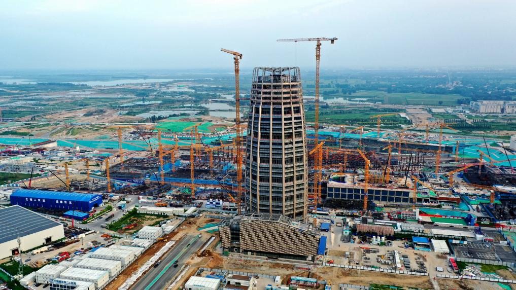 这是位于雄安新区启动区内的中国华能总部大楼建设现场(8月8日摄,无人机照片)。目前大楼已封顶,正在开展装饰装修。