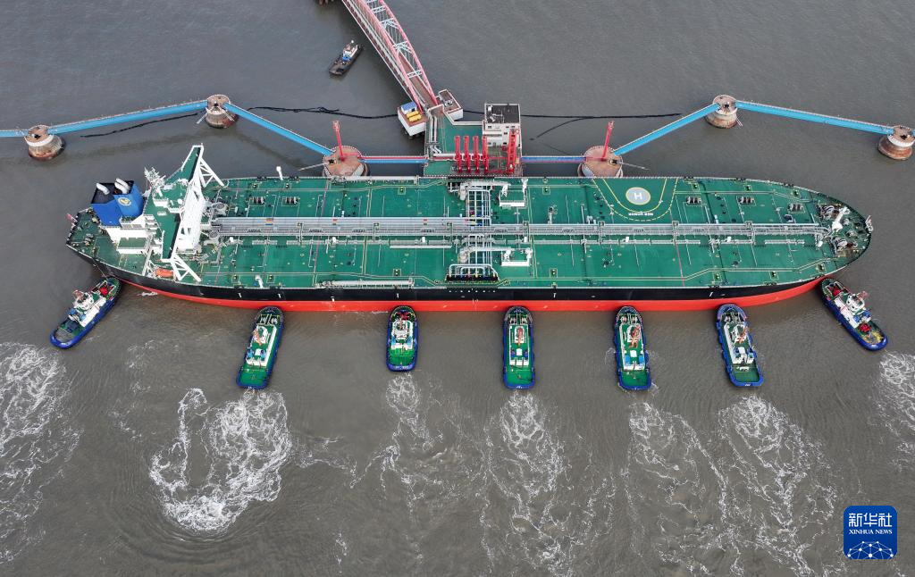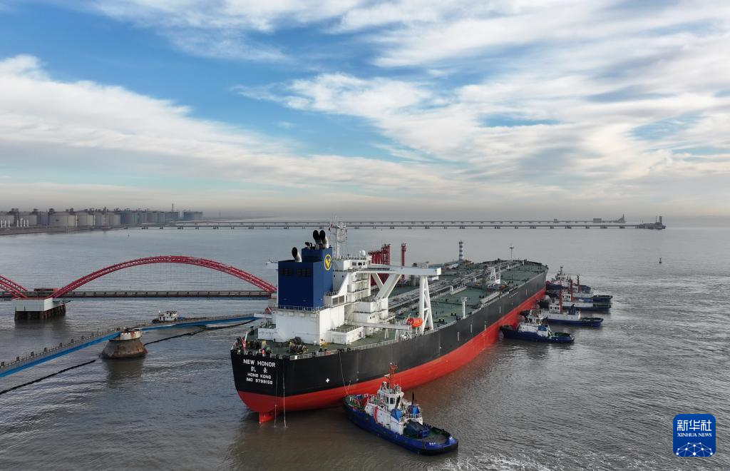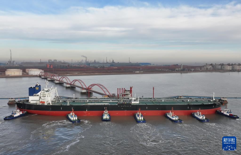 12月16日,一艘轮船在唐山港曹妃甸港区石油码头卸载后准备离港(无人机照片)。