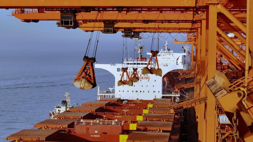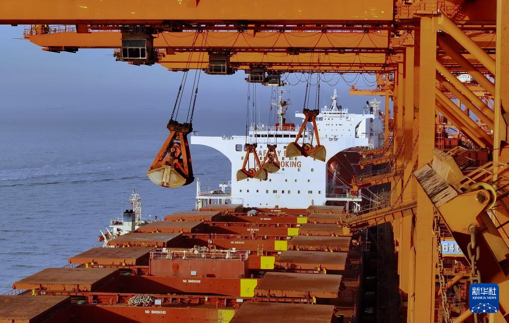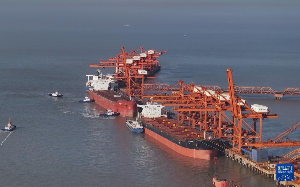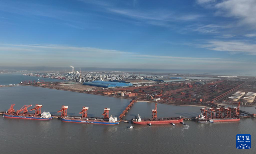 12月16日,轮船靠泊在唐山港曹妃甸港区矿石码头卸载(无人机照片)。