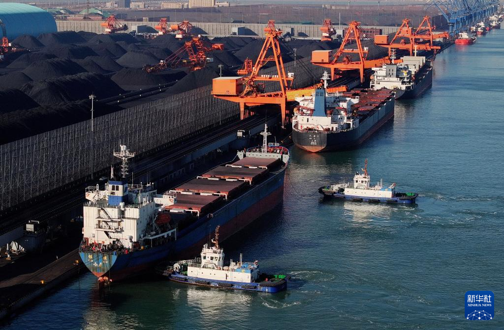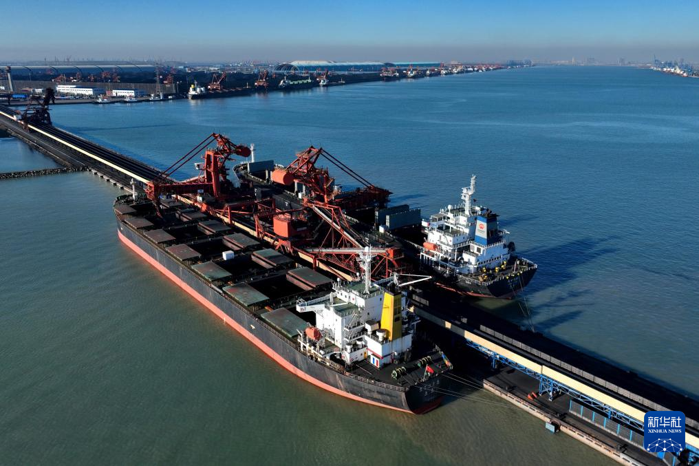 12月16日,轮船靠泊在唐山港曹妃甸港区煤炭码头装货(无人机照片)。