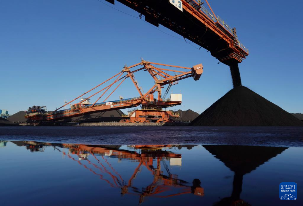 12月16日,唐山港曹妃甸港区煤炭码头堆场的堆料设备在工作中。