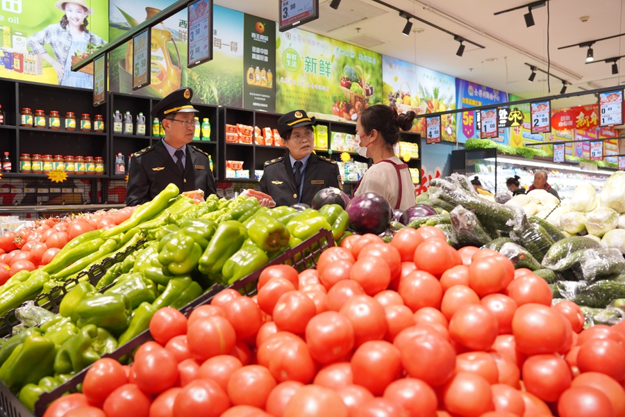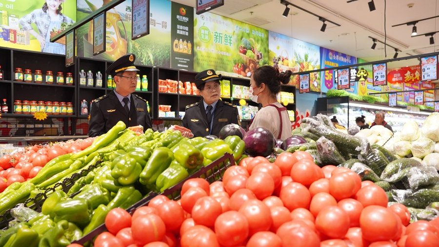 内丘县市场监督管理局工作人员对一家超市销售的蔬菜进行检查。刘继东 摄