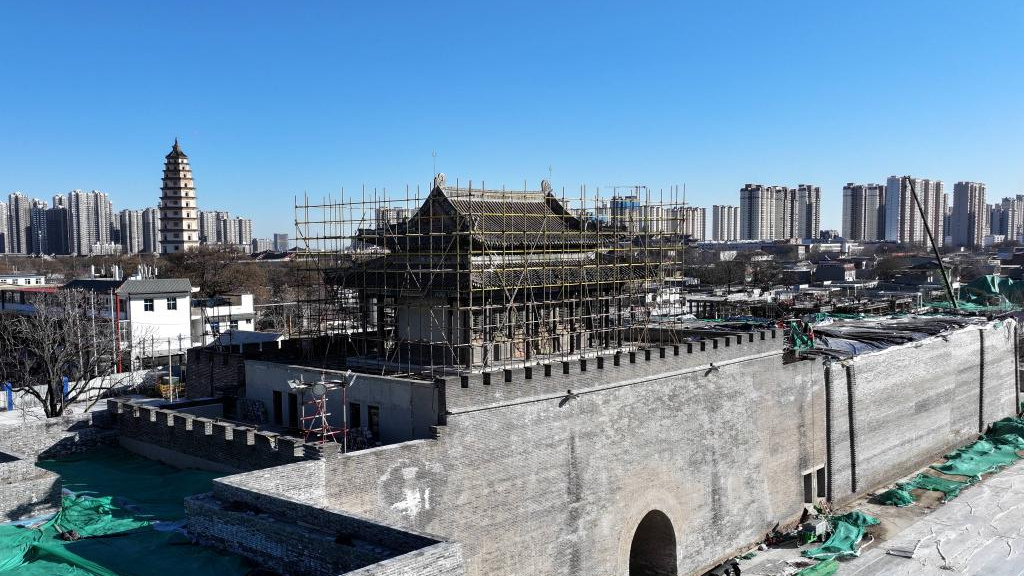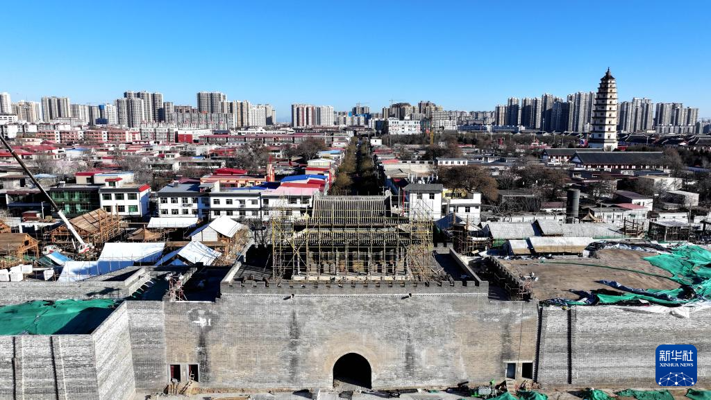 这是1月8日拍摄的正在修缮中的定州南城门(无人机照片)。