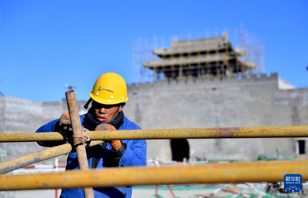 1月8日,施工人员在定州南城门施工现场进行作业。