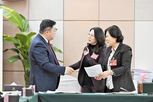1月12日,师伟力委员(右)和康曦文委员(中)、李建军委员围绕“科技红娘”话题进行讨论。记者 田 明摄