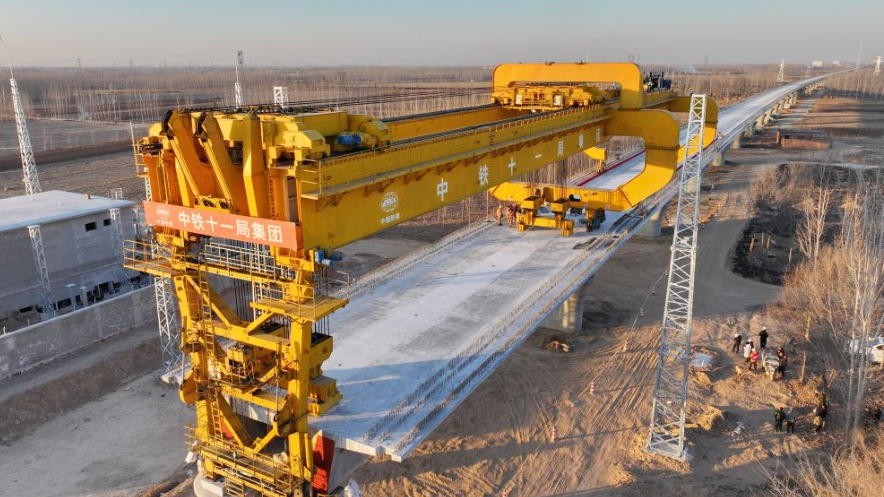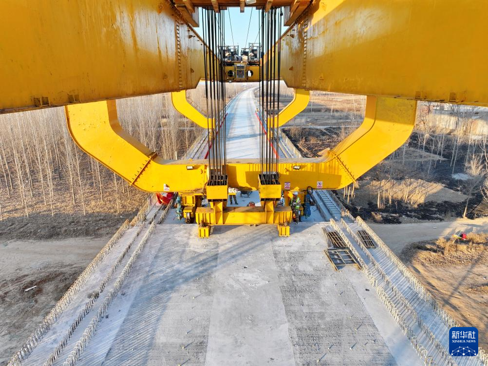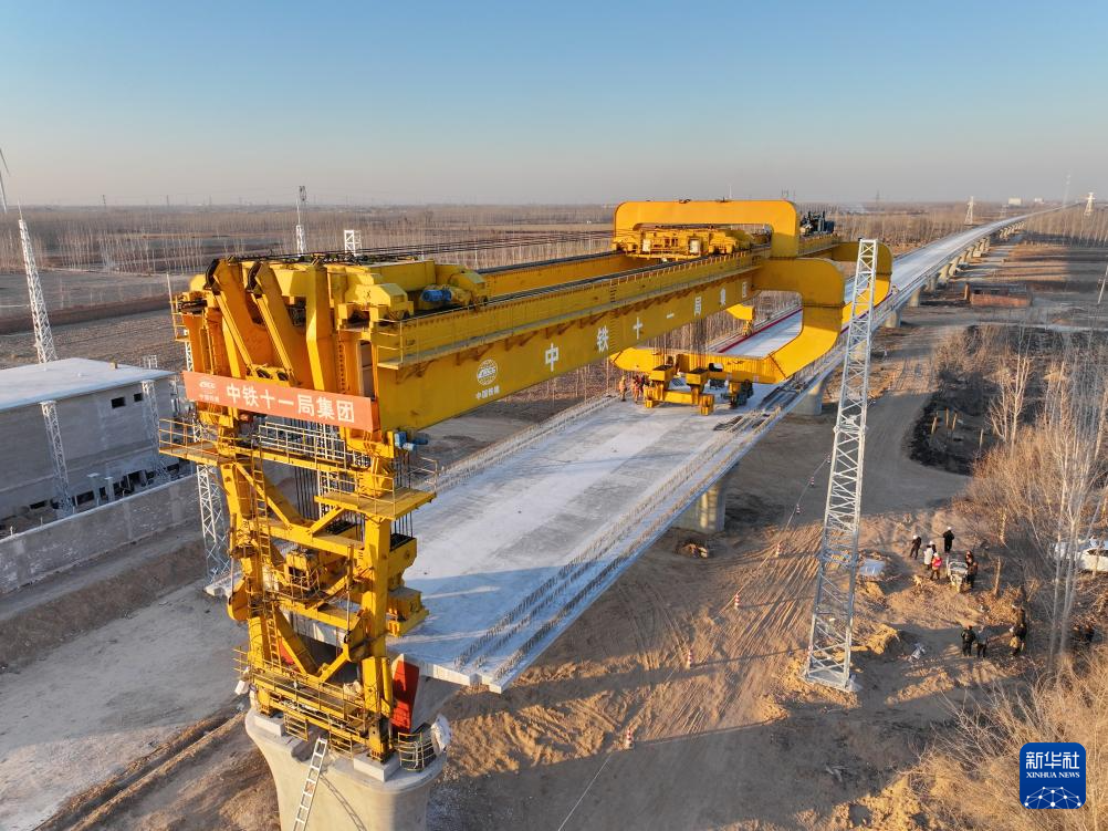 1月16日,中铁十一局集团架桥机在雄商高铁站前六标段最后一孔箱梁架设现场作业(无人机照片)。