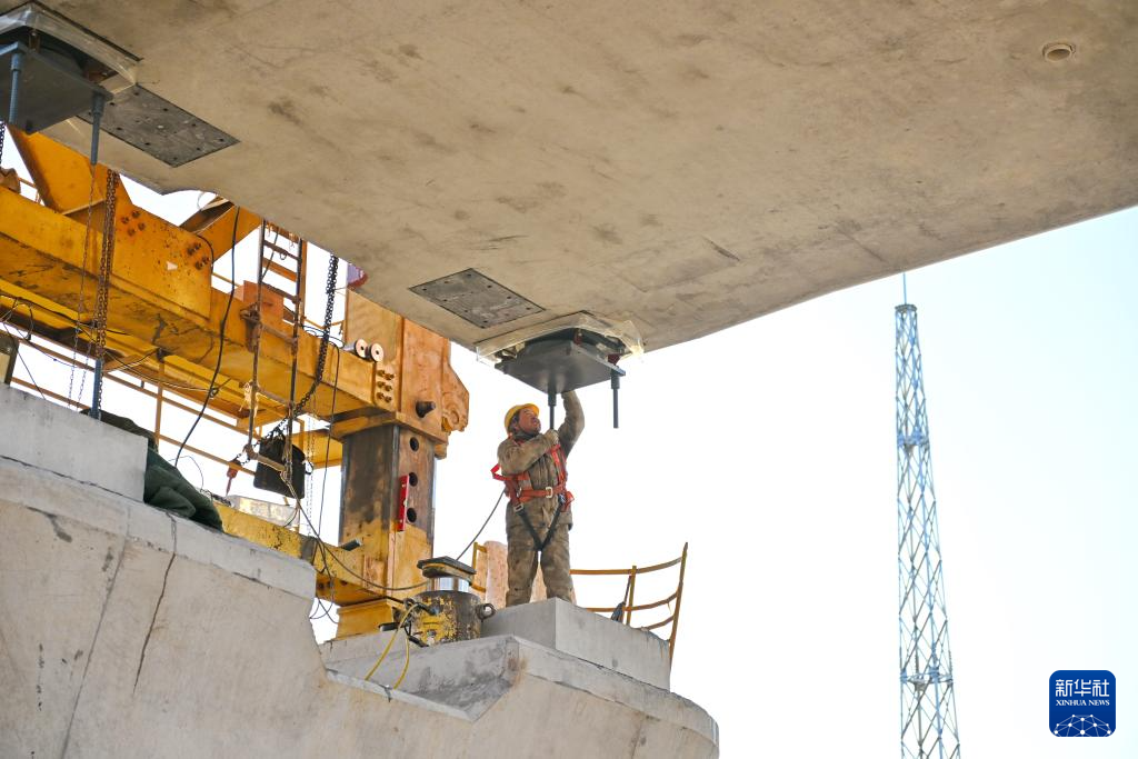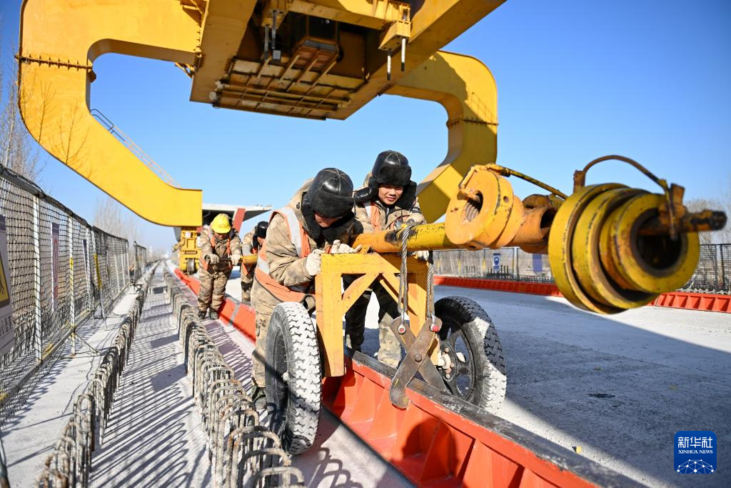 1月16日,中铁十一局集团工人在雄商高铁站前六标段最后一孔箱梁架设现场作业。