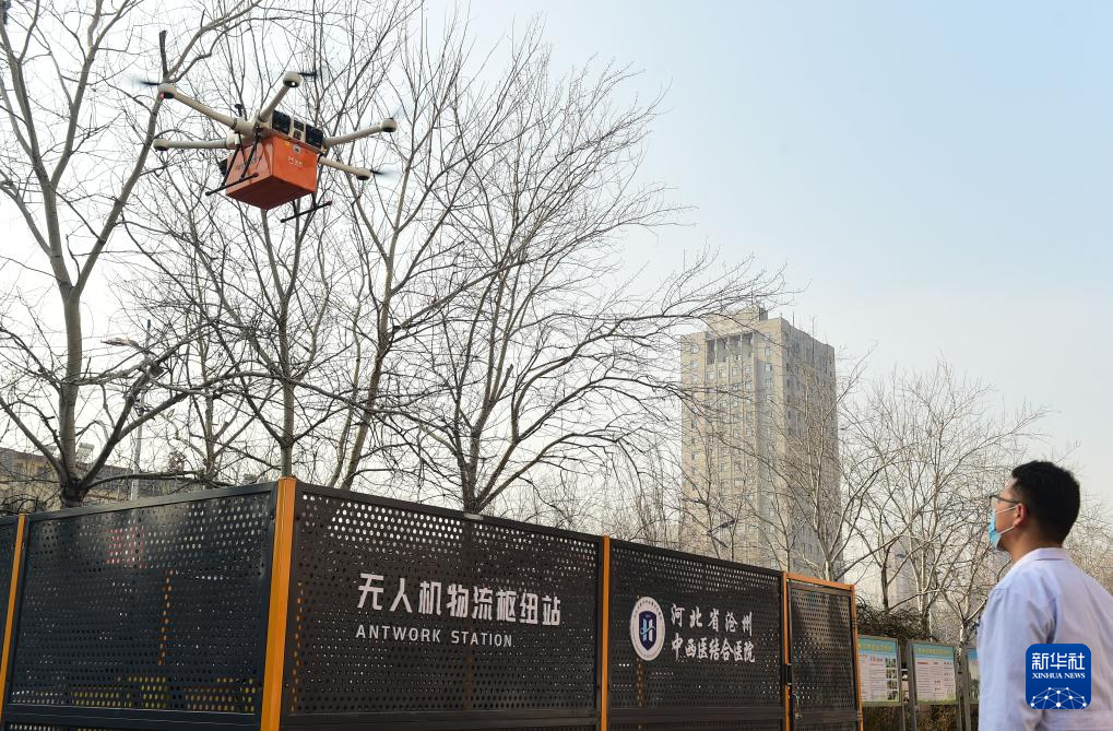 1月21日,搭载患者检验标本的无人机降落在沧州中西医结合医院本部院区。