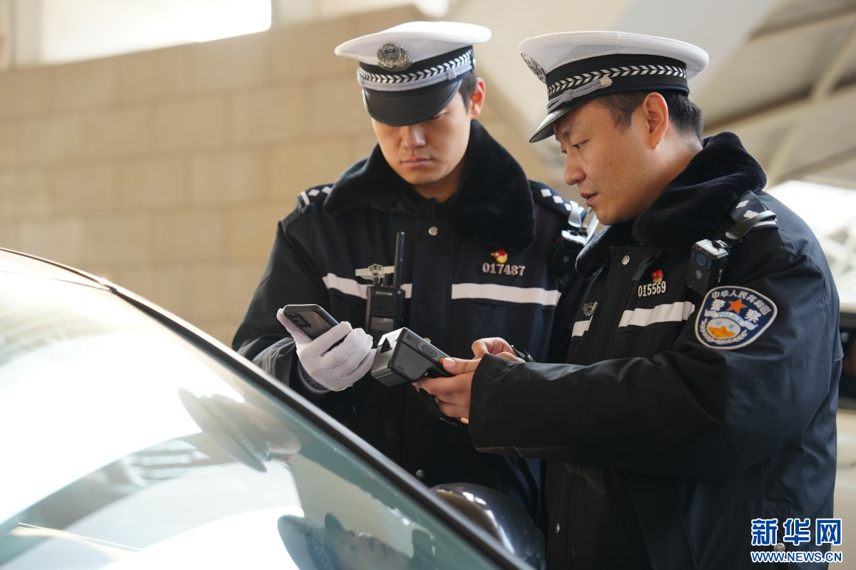 执勤民警现场查处交通违法行为并开具处罚决定书。新华网发 陈增凯 摄