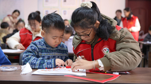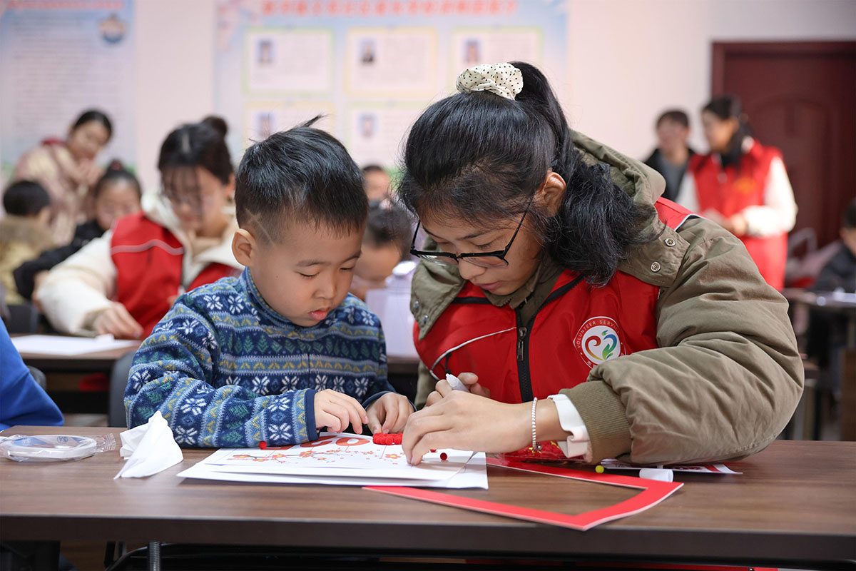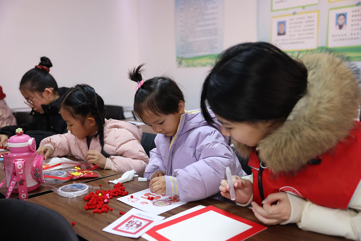 大学生志愿者陪伴社区儿童制作手工贴画。李世强 摄