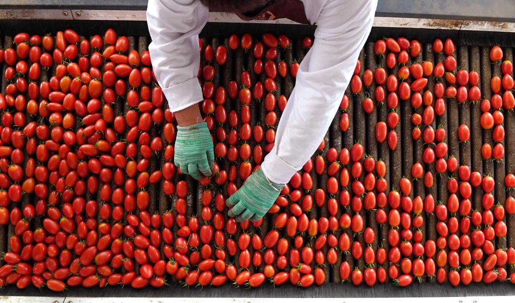 阜城县阜城镇张常巷村,村民在分拣樱桃西红柿。新华社发(崔贤飞 摄)