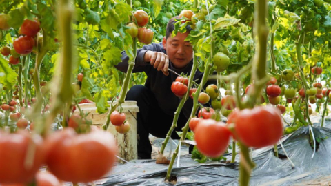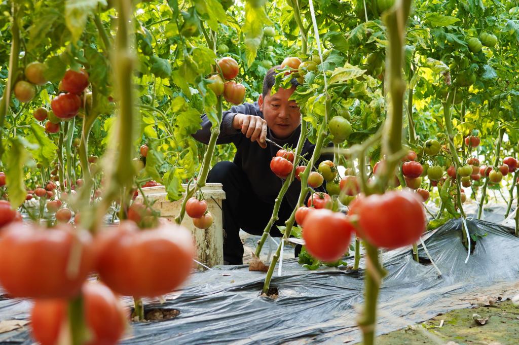 在固安县顺斋瓜菜种植专业合作社的温室大棚里,菜农在采摘西红柿。新华社发(吴迪 摄)