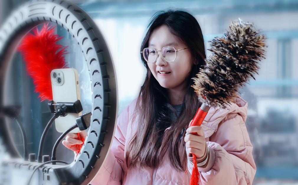 正月里,张麻湾村的掸子工厂迎来生产高峰期。寒假返乡的大学生张诗曼,除了每天拍摄一些关于鸡毛掸子的小视频,在各大社交媒体平台进行宣传,最主要的任务就是帮着村里做直播带货,至今她已经累计销售各种款式的鸡毛掸子上千把。