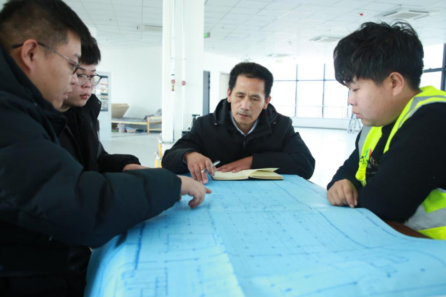 在项目部内,周培(右二)和工作人员对工程操作注意事项进行研讨。(受访者供图)