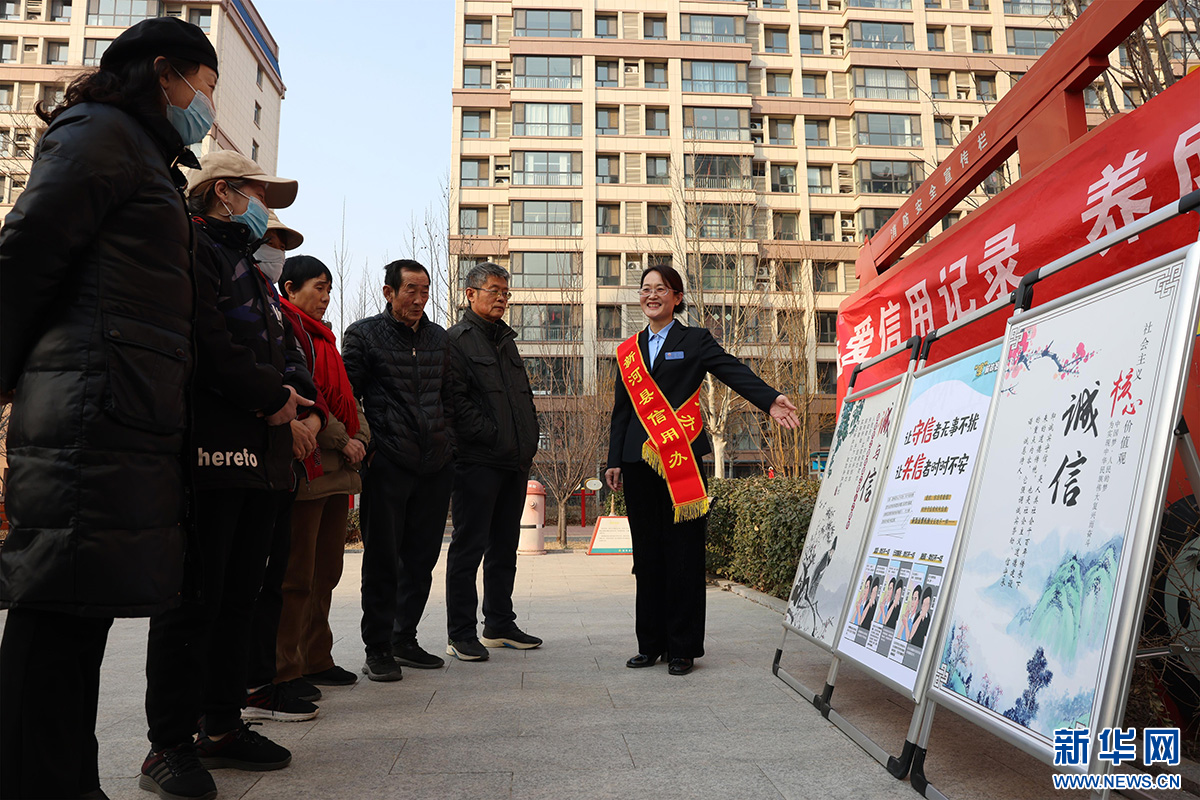 新河县行政审批局工作人员为社区居民讲解信用知识。新华网发 李世强 摄