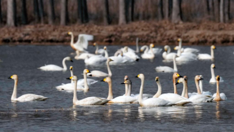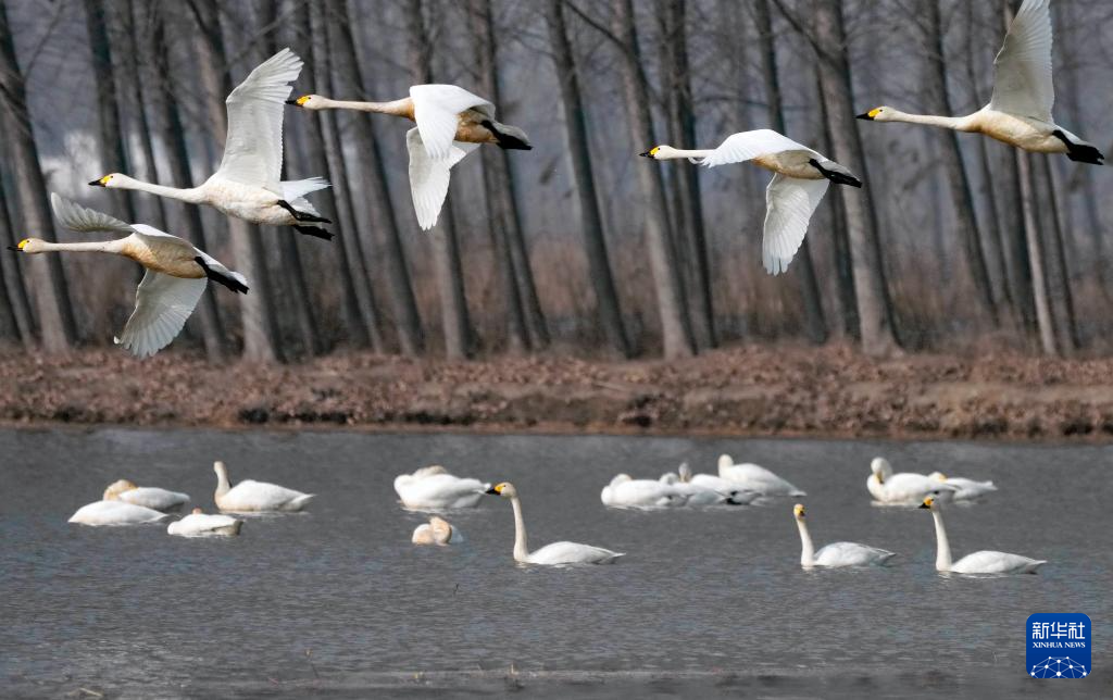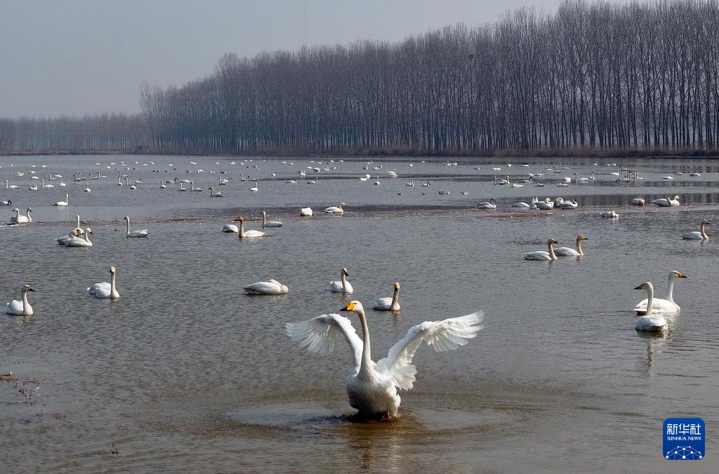 近日,大批天鹅飞临河北省唐山市曹妃甸区第五农场,在这里栖息、觅食,成为春季一道靓丽风景。