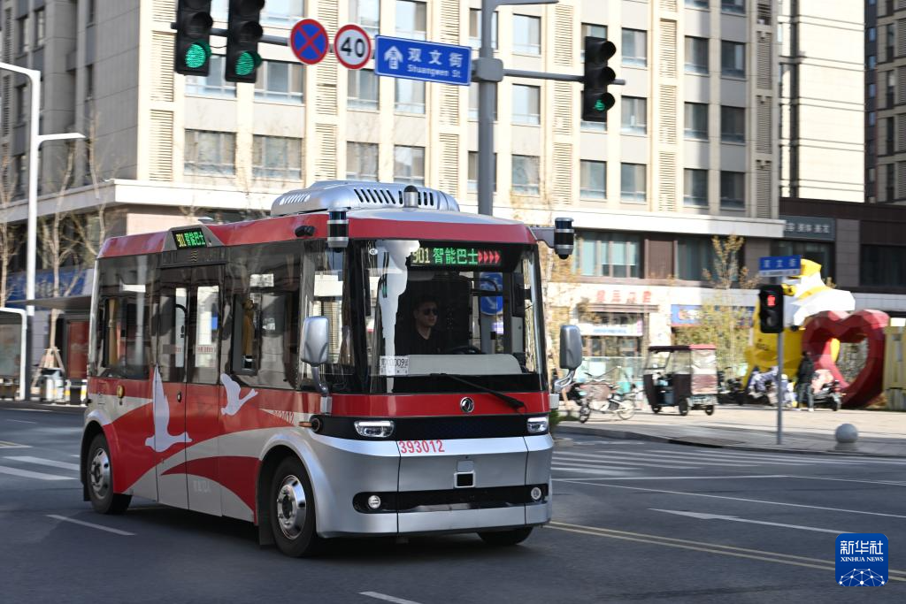 2024年3月29日,无人驾驶智能网联巴士在雄安新区容东片区道路上行驶。新华社记者 牟宇 摄
