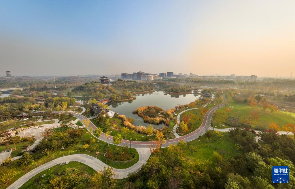 2024年11月7日拍摄的雄安新区悦容公园与雄安商务服务中心(无人机照片)。新华社发(落飞麟摄)
