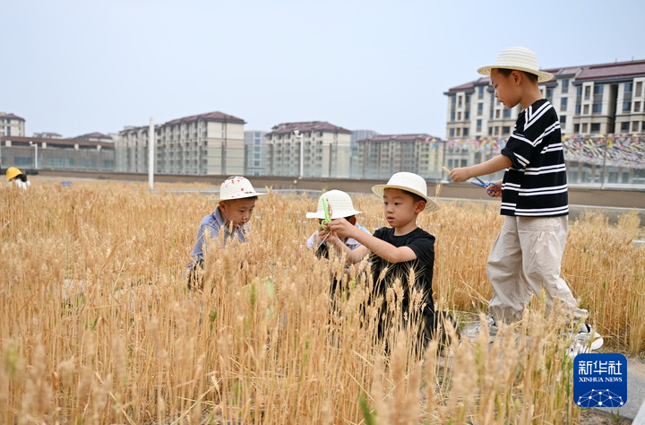 雄安容和悦容幼儿园的孩子们在“校园农场”里收获小麦(2024年5月23日摄)。新华社记者 牟宇 摄