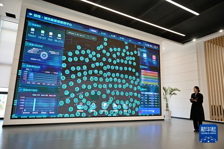 中电信数字科技有限公司的工作人员在展示容东片区数字道路运营系统(2024年3月29日摄)。新华社记者 牟宇 摄