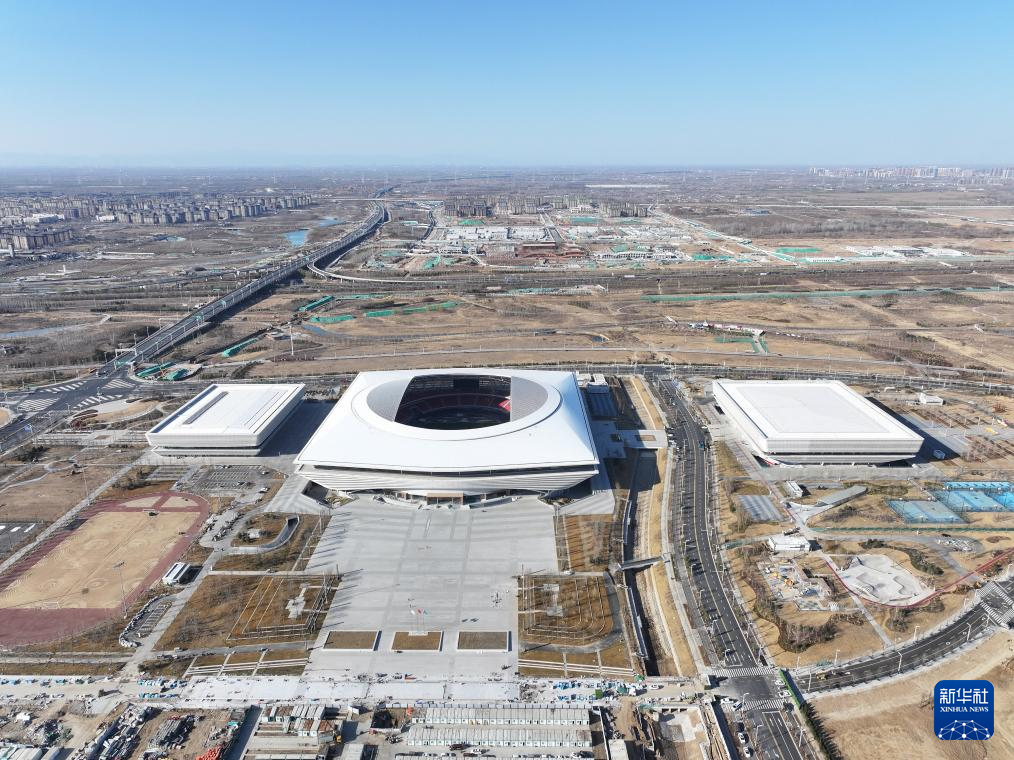 暖阳下,雄安体育中心的三座建筑宛如三枚印章,错落钤印于巨幅山水画卷之上。体育场弧形屋面向天际舒展,方形基座则暗合“黄琮礼地”,方圆之间尽显中华风范。