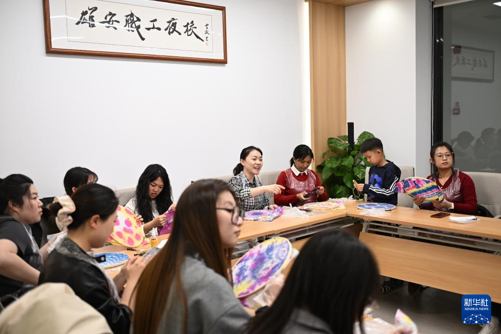 3月14日,雄安新区职工夜校的学员在容东康宁雄观书屋内制作扎染。新华社记者 牟宇 摄