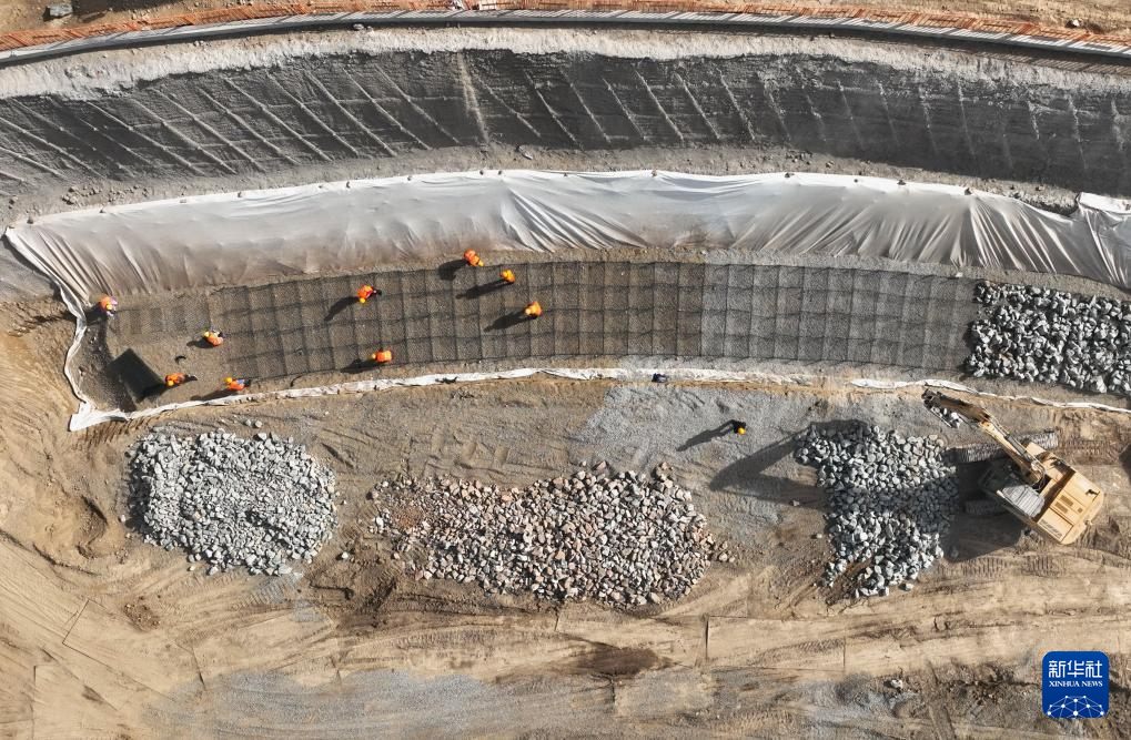 3月25日,工人在石家庄市东南退水明渠建设工地施工(无人机照片)。