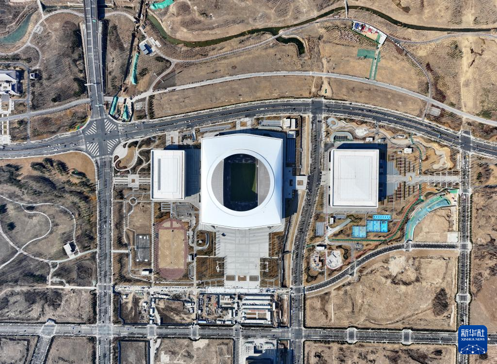 这是雄安体育中心(3月16日摄,无人机照片)。雄安体育中心的三座建筑形似三枚印章,体育场屋面呈现弧形,基座呈现方形,暗合“黄琮礼地”,方圆之间尽显中华风范。