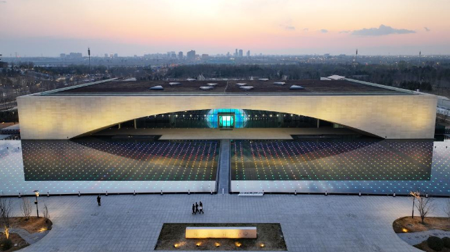 这是雄安新区大学园图书馆(3月16日摄,无人机照片)。该建筑立面设计形似简牍,折射出中国传统文化的韵味。