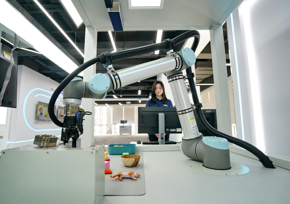 梅卡曼德机器人科技有限公司工作人员在演示工业机器人运行。新华社记者 牟宇 摄