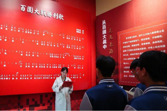 在百团大战纪念馆,浮雕上一幅幅生动的战斗场景仿佛将师生们带回到那段烽火连天的岁月。大家驻足凝视,透过一幅幅珍贵的历史照片和一件件饱含沧桑的实物展品,回望百团大战的历史场景。