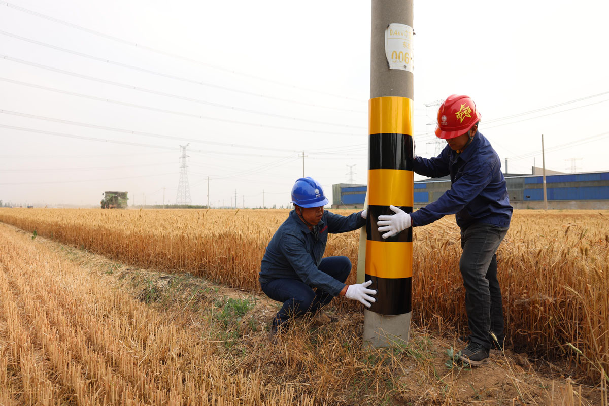 电力职工对田间的电杆粘贴防撞警示标识。李世强 摄