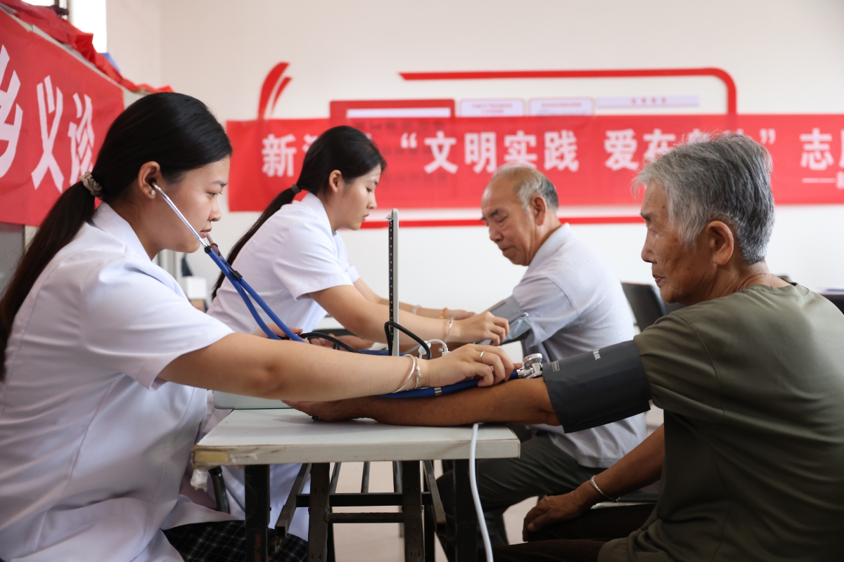 新河镇卫生院医务人员为老年人测量血压。李世强 摄