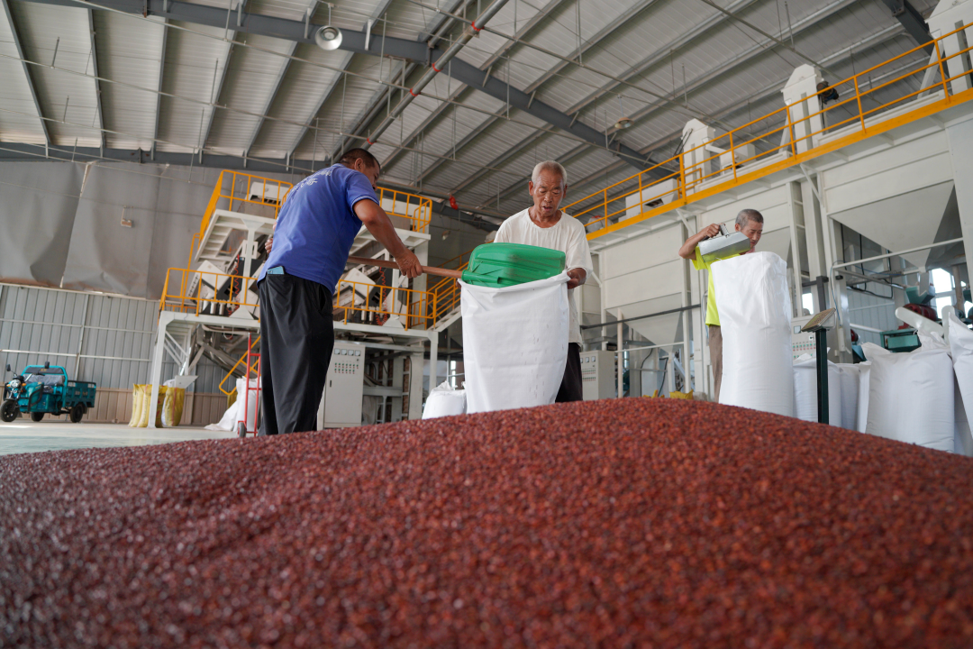 在内丘县北赛酸枣种植基地,枣农将酸枣仁装袋。刘继东 摄