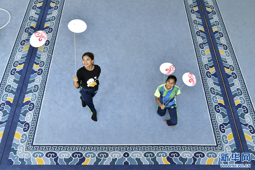 来自孟加拉国的学员在河北吴桥杂技艺术学校排练厅内练习杂技。牟宇摄
