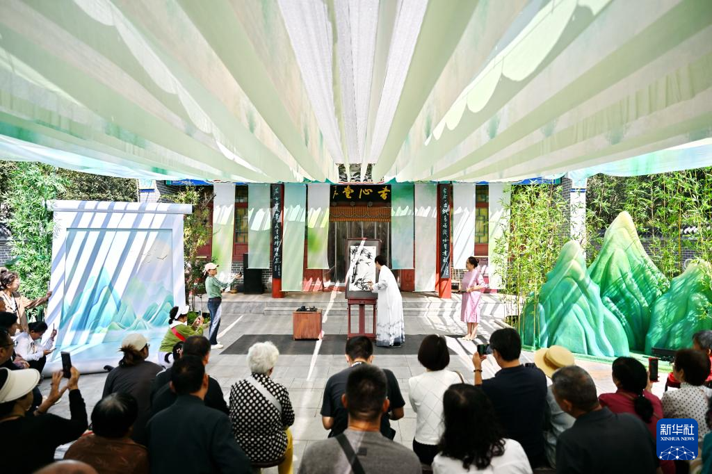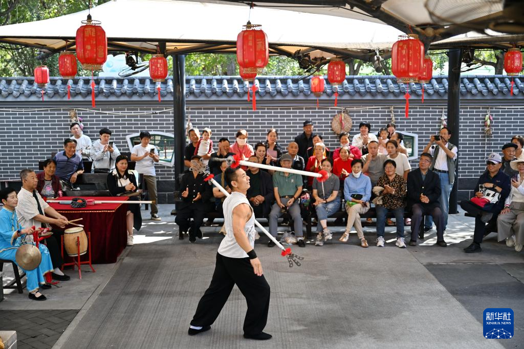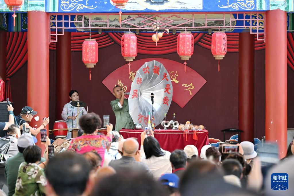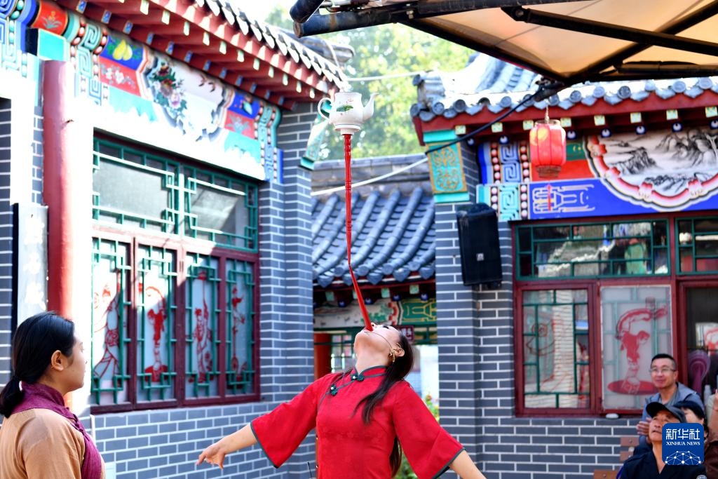 9月25日,游客在吴桥杂技大世界江湖文化城内观看演出。