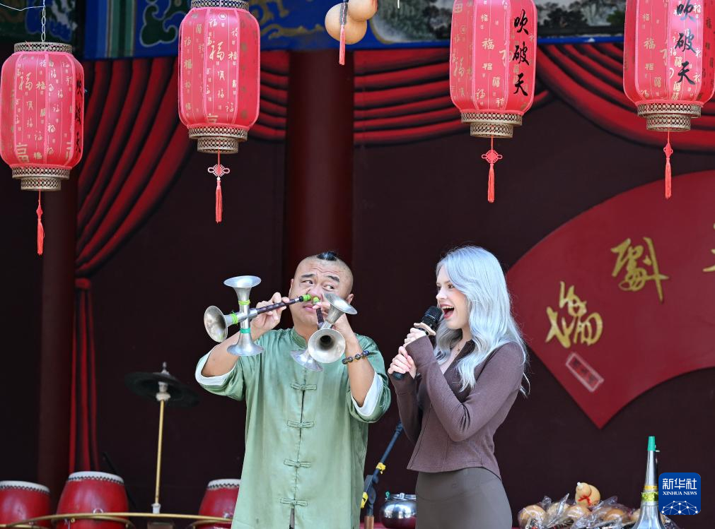 9月25日,在吴桥杂技大世界江湖文化城吹破天剧场,来自俄罗斯的游客与杂技艺人互动。