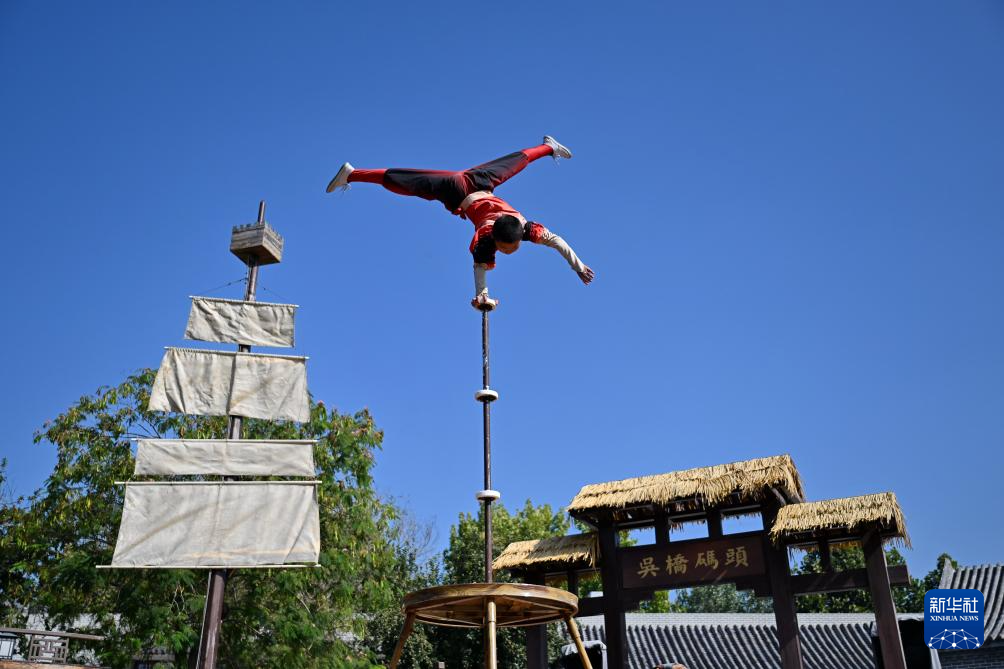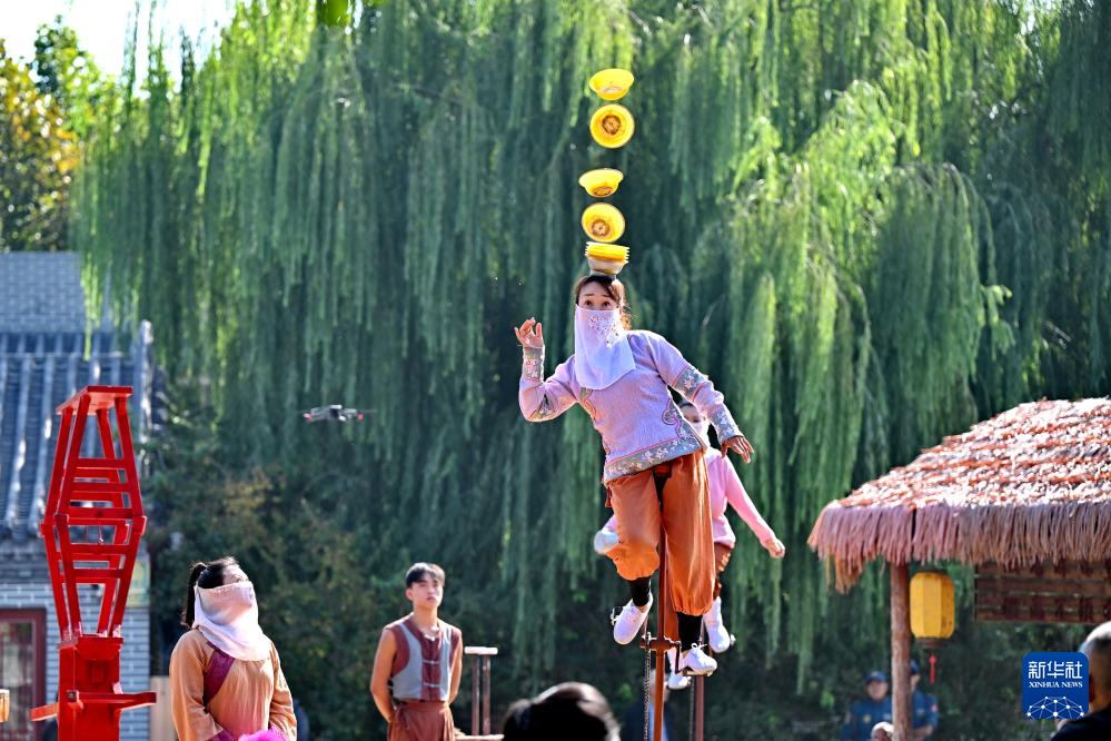 9月25日,杂技艺人在吴桥杂技大世界江湖文化城内表演。