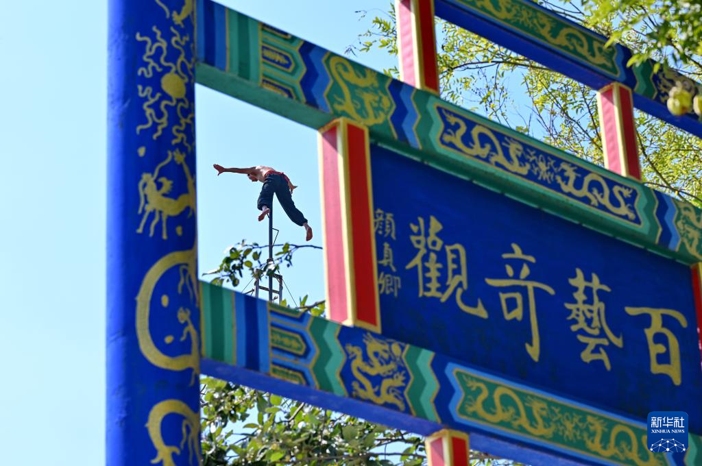 9月25日,杂技艺人在吴桥杂技大世界江湖文化城内表演《上刀山》。